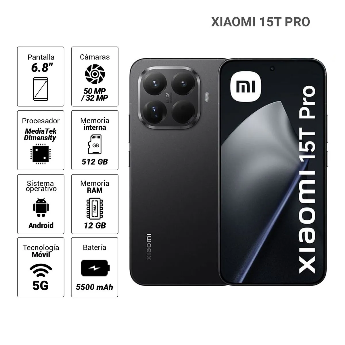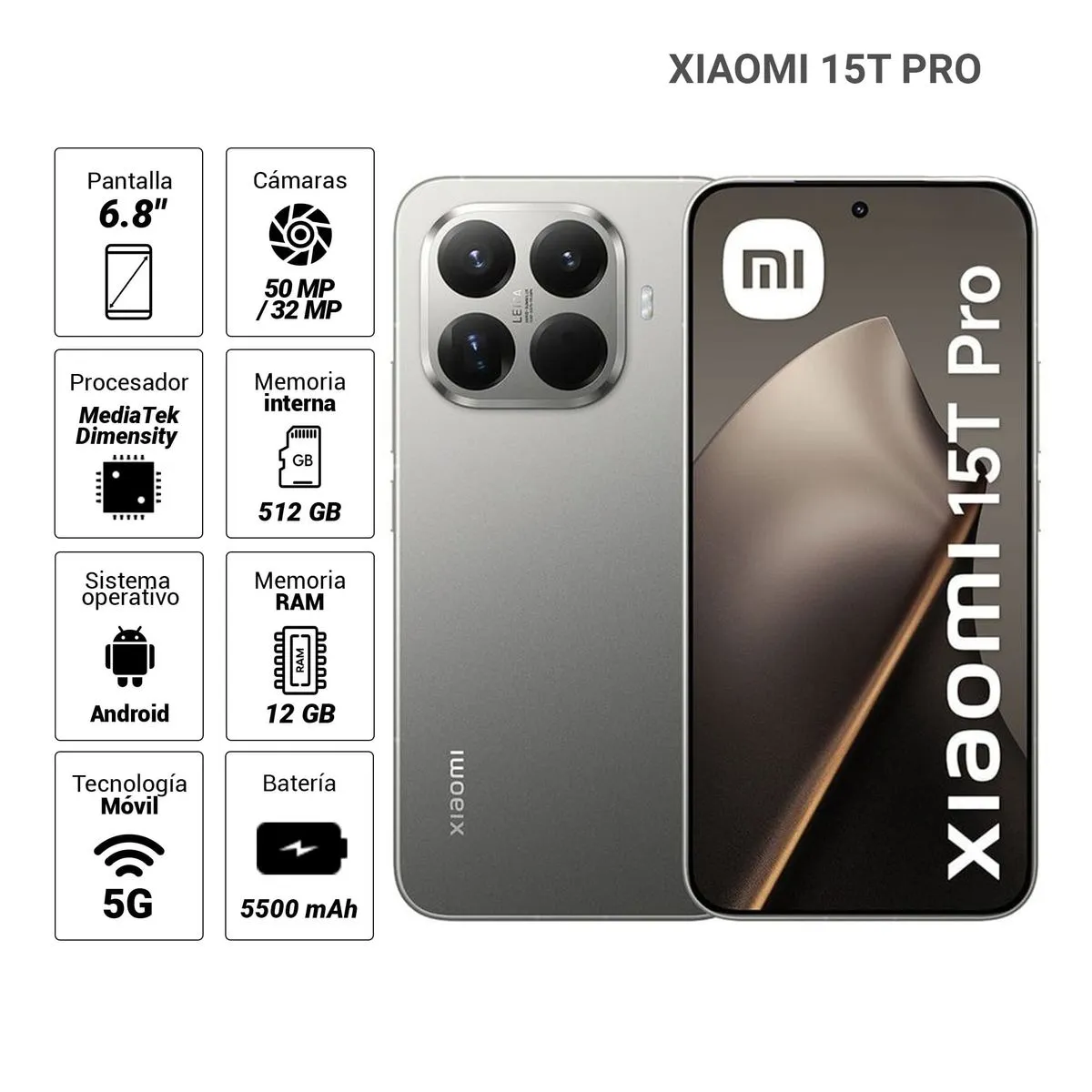 Celular Xiaomi 15T PRO 5G 512GB, 12GB RAM, cámara principal 50MP + 12MP, frontal 32MP, 6.8″, gris